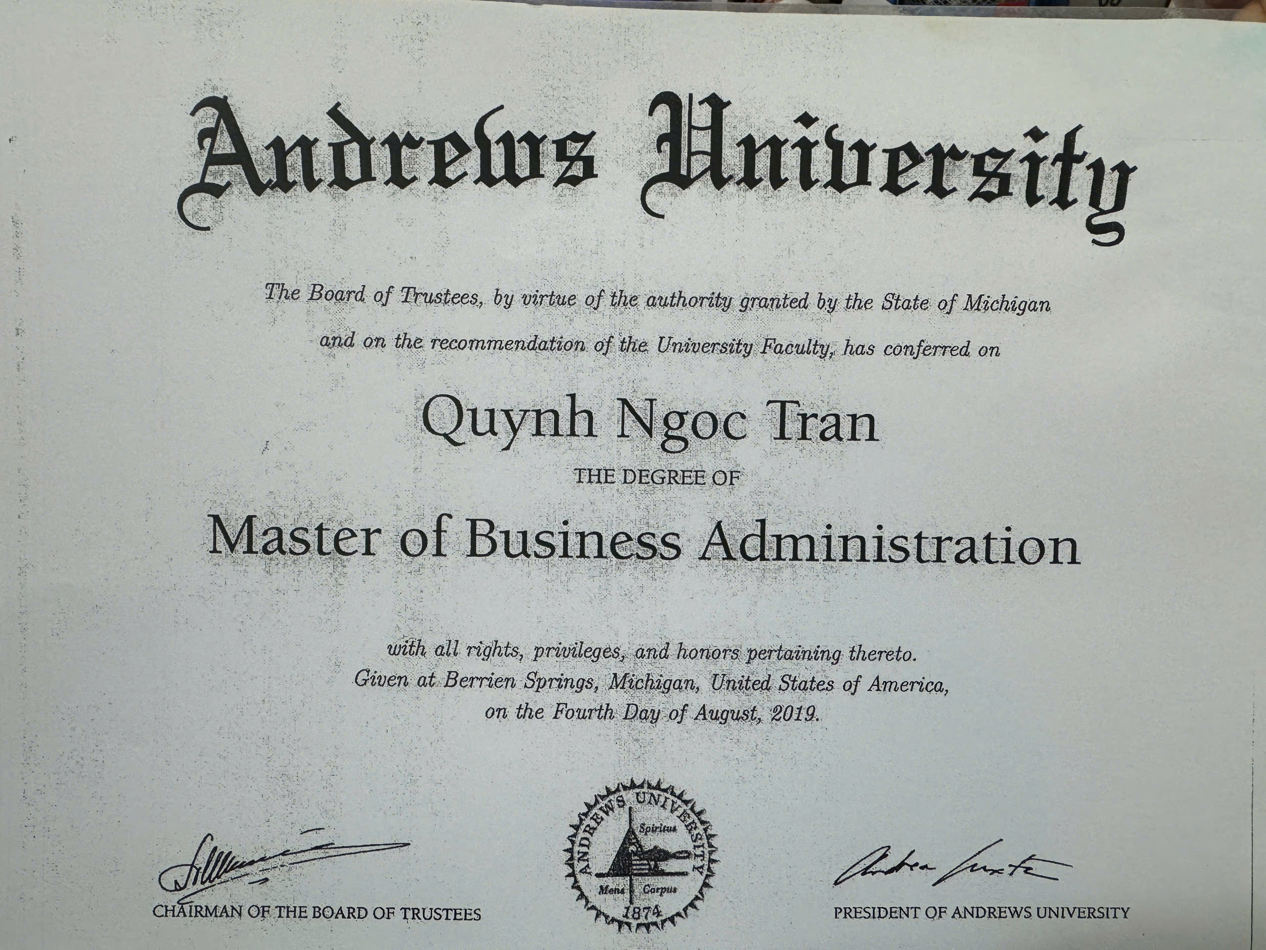 Sau khi hoàn tất chương trình học, học viên sẽ được cấp bằng Thạc sĩ Quản trị Kinh Doanh bởi Đại học Andrews, Hoa Kỳ.